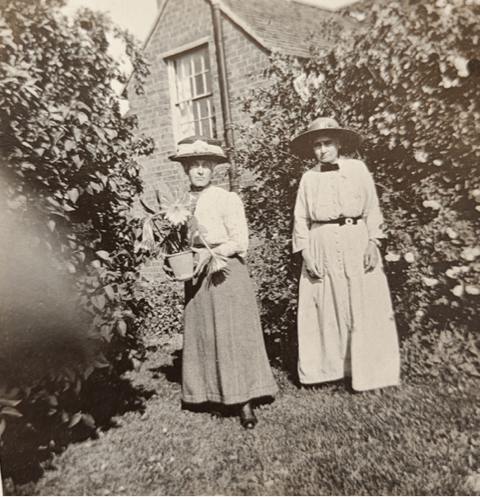 In 1908 the house and 0.75 acre of land were sold to Miss Harriett Thompson, who was already there as a tenant. Harriett described herself as lady gardener in the 1911 census. This photograph of two ladies in the 1900s is believed to show Harriett standing outside Summerfield but we do not know which of the two she is or the identity of the other lady.