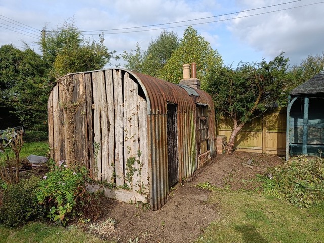 Winifred Postlethwaite was living there at the time of the 1939 National Register. The house was requisitioned by military personnel during the war, with Winifred being relegated to living in a purpose-built nissen-style hut in the garden. This was provided with essentials such as a chimney and cooking stove and an outside solid fuel heated laundry tub. The hut had survived in a dilapidated state, as shown in this photo, when the current occupants moved in a few years ago; it has since been restored, retaining all its original features, to make a pleasant garden-room.
