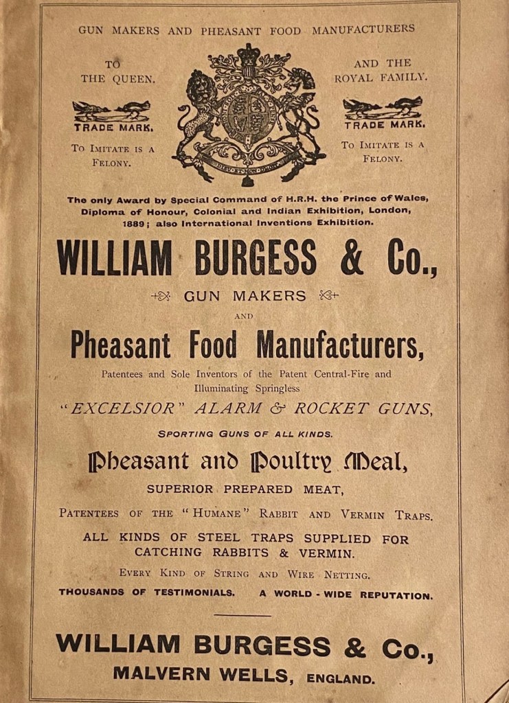 A series of fascinating images was recently posted online* by John Clements, whose family, close friends of my forebears, has farmed for generations at Brotheridge Green near Upton-on-Severn in South Worcestershire. The individual plates in an illustrated catalogue from William Burgess & Co, dated 1897, include photographs titled ‘View of Pheasantries at Malvern Wells’ and ‘Danemoor Ponds: Malvern Wells Fishery’, as well as earlier price lists of livestock, guns and line drawings of a wide variety of fiendish metal traps – including ones for poachers. All supplied by Wm. Burgess & Co, the proprietors of these twin establishments and self-proclaimed ‘Sportsmen’s Universal Providers’.