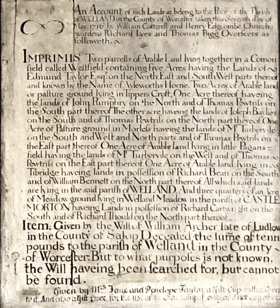 An account of such Lands as belonging to the Poor of the Parish of Welland in the County of Worcester, taken this seventh day of May 1716 by William Cotterill and Henry Edgcombe Churchwardens, Richard Lyes and Thomas Bigg Overseers as followeth.